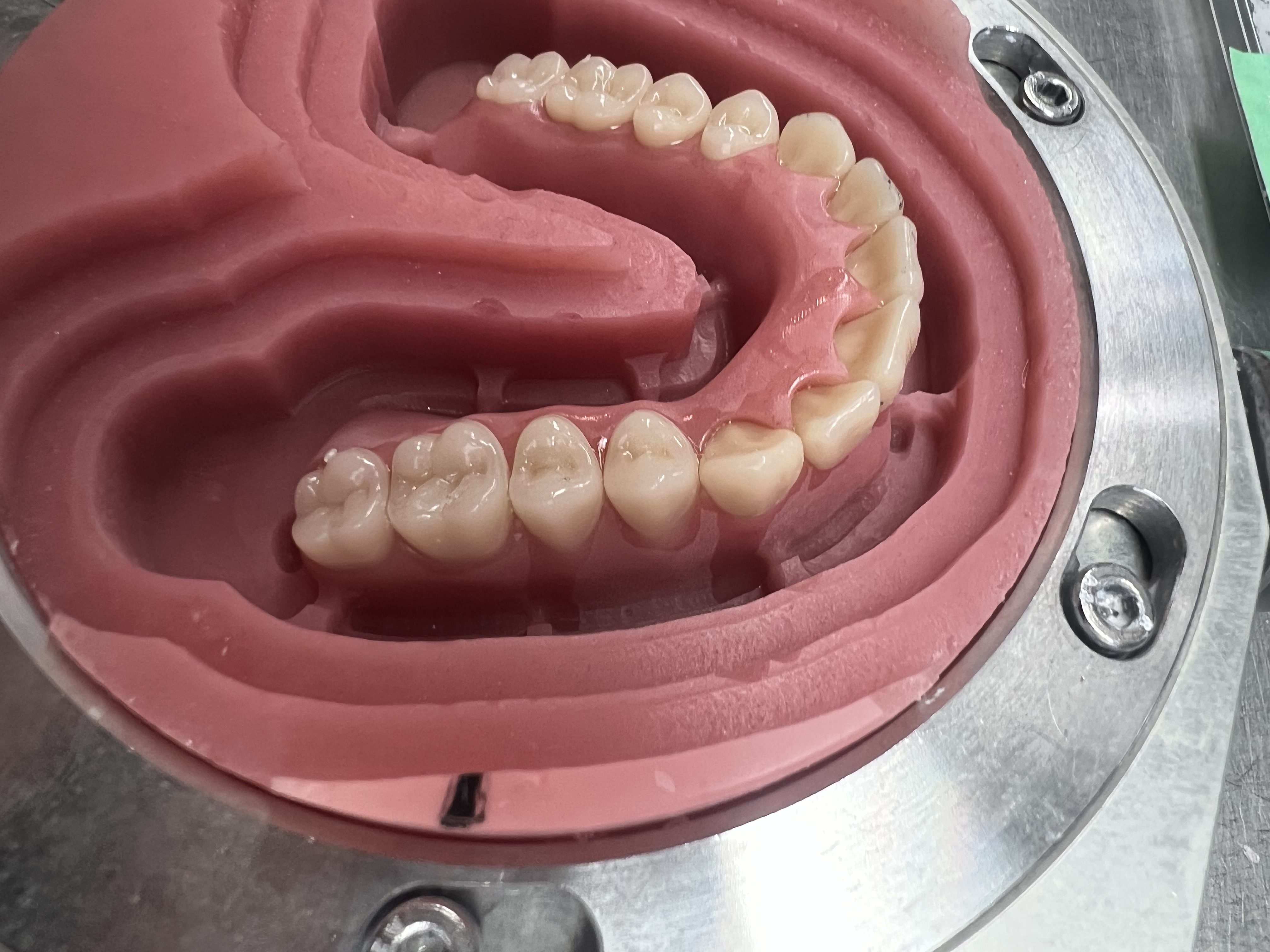 Onze Freesmachines hebben 5 assen waardoor hij een maximaal bereik heeft voor het maken van tandtechnische werkstukken uit verschillende materialen. Zirkonium, kunststof, Chroom Kobalt kunnen we frezen. Maar ook watergekoelde materialen als Titanium, Glaskeramieken is voor onze machine geen probleem.